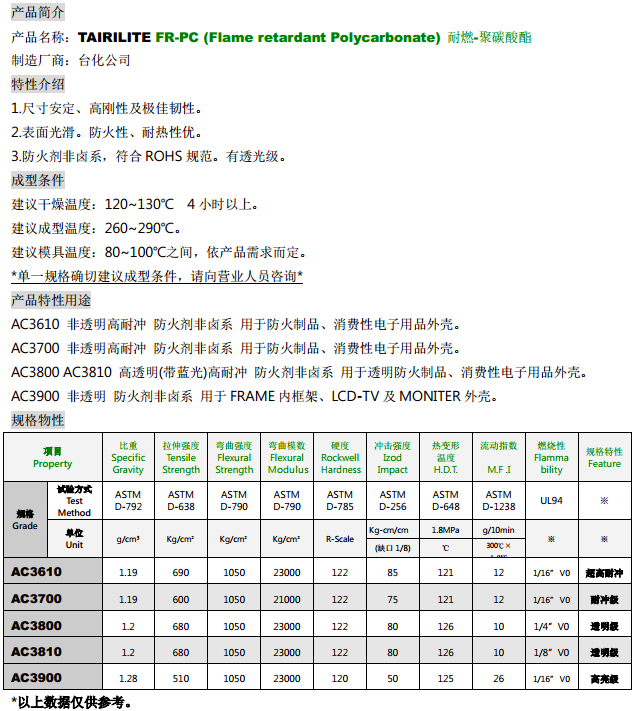 PC 耐燃級 | 1.非透明性 2.高耐衝擊強度 3.射出用途 4.非鹵系、符合RoHS規範 5.符合UL 1.5mm V-0 | 一般防火要求之製品如 充電器外殼、遊戲機外殼、消費性電子 用品外殼 | |