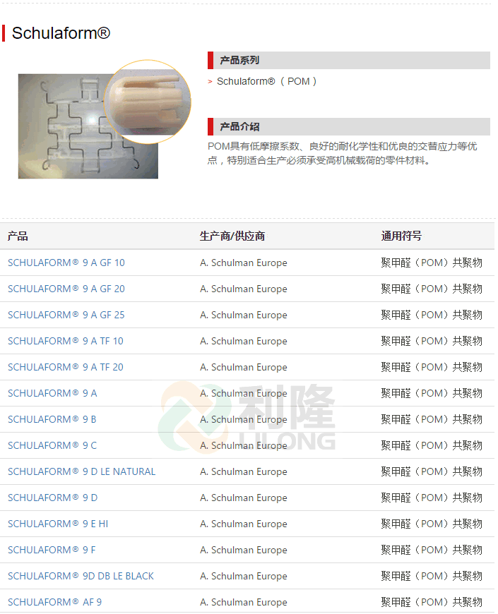 [塑料簡介:]利隆塑料專業(yè)經(jīng)營美國舒爾曼POM聚甲醛SCHULAFORM品牌塑膠原料,想要了解聚甲醛POM塑膠原料,舒爾曼POM原料價格,POM性能用途,POM型號和POM物性的客戶,歡迎來電來函咨詢