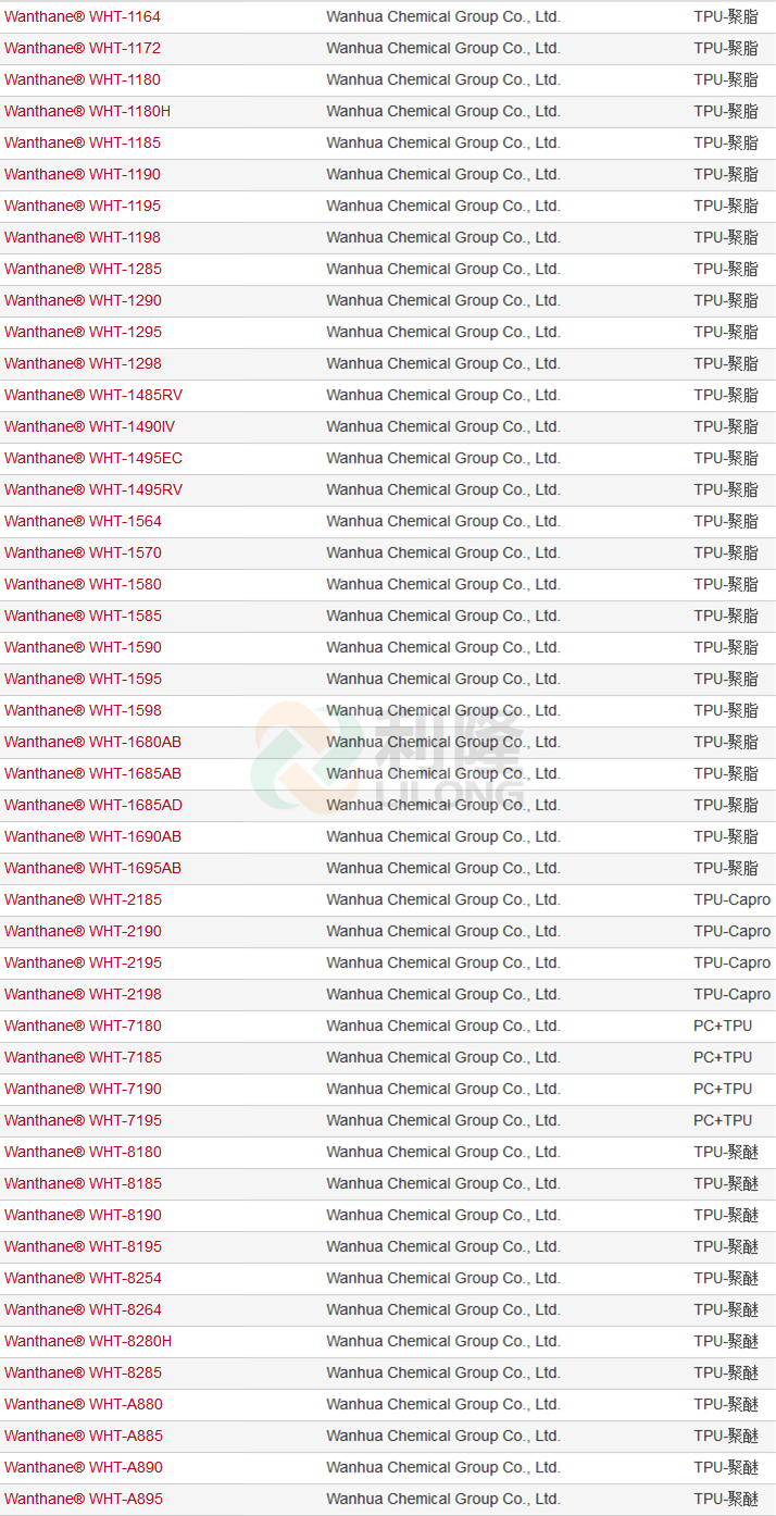 WANTHANE® 是煙臺萬華TPU產品注冊商標,煙臺萬華是中國TPU產品系列和所覆蓋應用領域最全面專業TPU生產商,產品系列主要有聚酯型(WHT-11/14/15/16/19/61/62系列)、聚醚型(WHT-8X系列)、聚己內酯型(WHT-21系列)、聚碳酸酯型(WHT-71系列)和脂肪族TPU等五大系列,各系列產品主要特點如下: